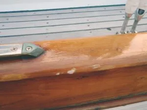 Compared to a clear, glossy varnish, it looks decent and the maintenance regimen is more realistic for our tastes and available time. However, one downside to softer, varnish alternative coatings—even those with an overcoat—is that they don’t stand up as well as hard finishes to dings and abrasion. Example: The Union’s toerail has one place in need of touching-up where a fender line wore away the finish. (See photo above.)