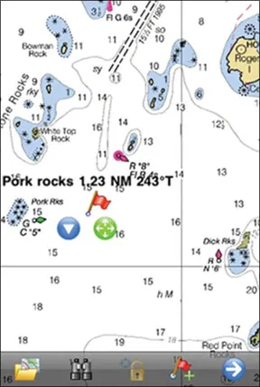 The onscreen device for waypoint management is one of the cleverest bits of thinking and programming weve seen for handheld instruments. To set a waypoint, the user taps the flag icon at the bottom of the screen, and a three-element waypoint controller appears: a flag whose staff can be planted with accuracy, a four-way directional button that is used to drag the flag without obscuring it with a fingertip, and a menu arrow that lets the user edit the waypoint information or delete it right from the chart screen.