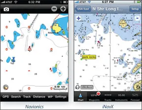 With A-GPS navigation capabilities, the iPhone is a natural conduit between marine cartographers and users, and there are several nav apps already available. Well concentrate on two companies that have established the biggest presence, Navionics and iNavX, and one we mentioned in the December issue, Memory-Map. Since its impossible to list all the features of each app, well focus mainly on the cartography and user interface.