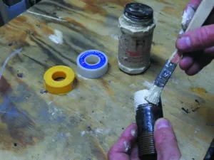 Apply dope by brushing at a 45-degree angle to the threads. This will fill the grooves better than brushing in the direction of the threads. Apply dope only to male threads in sizes up to 1¼-in. Apply to male and female in larger sizes. I often use a cutdown ½-in. chip brush, because the brush attached to the cap can become worn out.