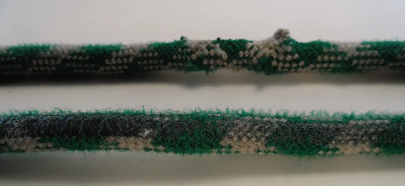 Look for fibers that shed when rubbed with your fingernail. Although the conventional wisdom is that the cover bears the brunt of the damage, we’ve found that with lighter colors the damage can go clear through a 3/8-inch line. The portion of a halyard that lives inside the mast is likely fine, while the bit near the masthead may be severely degraded by UV and chafe.