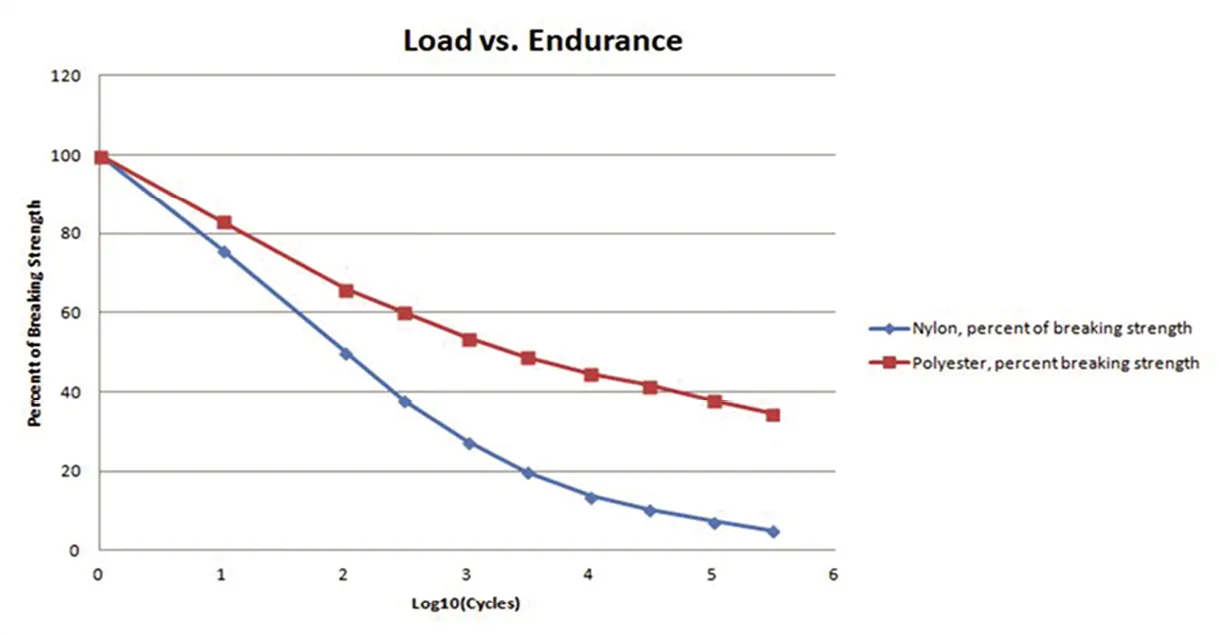 After about 50 to 100 cycles at the working load limit, permanent elongation levels out at 3 to 5 percent, depending on rope construction and fiber. The fibers become more closely fitted, and rope becomes somewhat firmer, although it becomes as limber as new with a little flexing. Elongation is also stable: in nylon rope, there is 2.5 percent elongation at 10 percent breaking strength; in polyester rope, there is 6 percent elongation at 10-percent breaking strength. Little will change in 100,000 cycles at this level. The rope will not get much longer, and the elasticity will not be noticeably reduced. Ropes are expected to last more than 100,000 cycles at the working load limit (more than 1,000,000 for polyester) and will most likely die from UV and chafe before fatigue becomes an issue. Remember that for properly sized ground tackle and snubbers, most of the load cycles while anchored will be far below the WLL. In practice, lines that are not overloaded are known to last a very long time.