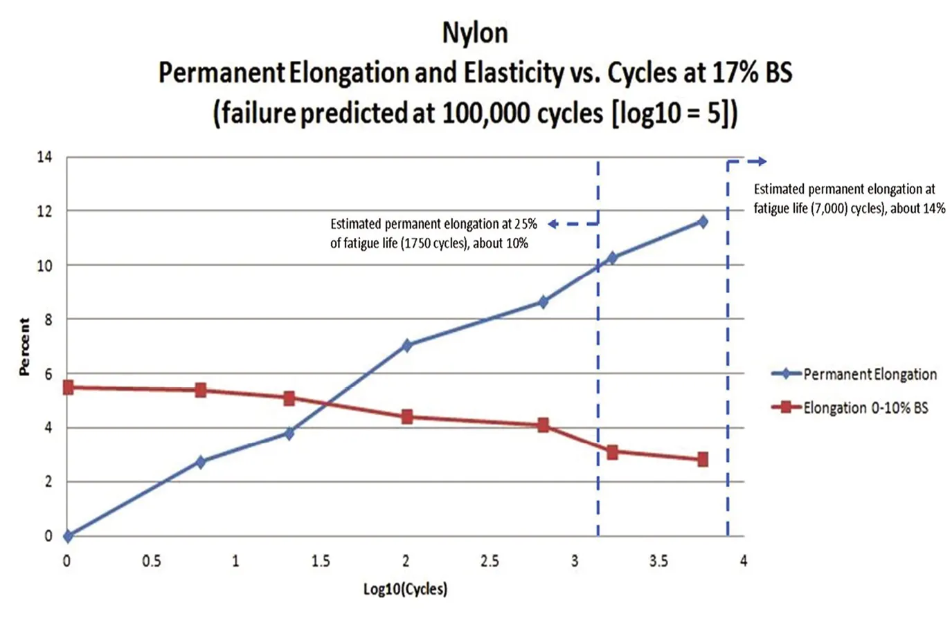 Any additional permanent elongation after the bedding process is the result of some portion of the fibers being loaded beyond their elastic limit, which may be as low as 35 of the breaking stress. Not all of the fibers share the load equally, and the elastic limit (or yield stress) of nylon fibers is not as well defined as it is for metals. Metals hold up well until very near the elastic limit, beyond which they deform and fail rapidly from fatigue. In nylon rope, this degradation in strength is more gradual, starting at about 25 percent of breaking stress and accelerating rapidly above that (see “Used Nylon Three-Strand Rope Faces The Ultimate Endurance Test”). More than a few percent excess permanent elongation can indicate that the rope has experienced an extremely high load and its life expectancy has been compromised.