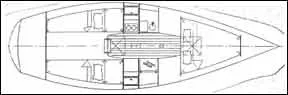 In most respects, the Olson 30 is a good sea boat. Although the cockpit is 6 1/2′ long, the wide seats and narrow floor result in a relatively small cockpit volume, so that little sea water can collect in the cockpit if the boat is pooped or knocked down. However, foot room is restricted, while the width of the seats makes it awkward to brace your legs on the leeward seat. The seats themselves are comfortable because they are angled up and the seatbacks are angled back. There are gutters to drain water off the leeward seat. The long mainsheet traveler is mounted across the cockpit—good for racing but not so good for cruising.