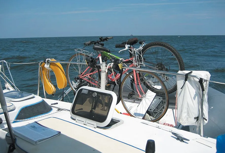 Although I can see the appeal of a folding bicycle, they don’t pack much smaller than my 22-pound Fuji, and they are not nearly as fun to ride. I’ve never had trouble finding room for my Fuji on the boat. The wheels easily pop off. I turn the handlebars 90 degrees and stuff it down the hatch. On a boat with even less room, the wheels and frame can be stowed in separate lockers.
