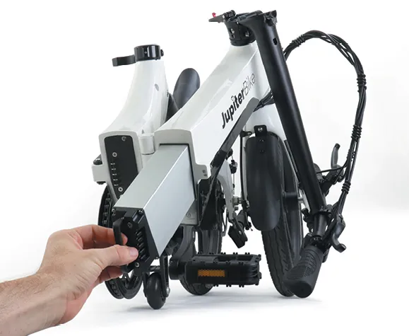 1. The Jupiter Discovery X-5 achieved a compact size when folded in part because of the 16-inch wheel size. The 5Ah lithium battery slides inside the frame.