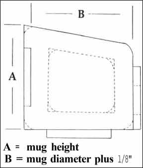 The illustration is pretty self-explanatory. Note that two styles of front bar are shown in the perspective drawing. The single, straight bar shown on the left works well if the mug handles clear the bar or fit into a corner. For most modern mugs which have a longer, deeper handle, a cutout like that shown on the right will be needed. The bottom and back bars should be about two-thirds the width of the sides of their’ respective uprights.