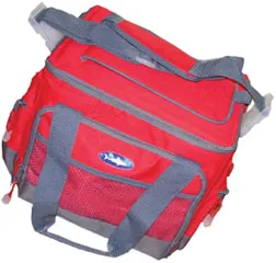 This cooler, sold at Boaters World as the ATE Expedition, has zippered side pockets plus a zippered front pocket and a mesh pouch in front of that. The zippers have cord extensions and plastic grippers. Theres a padded shoulder strap, and carrying handles with a padded hook-and-loop closure. The shell is red and gray 600-denier nylon, and inside is 5/16-inch insulation. A magnetic quick-grab door allows you to dive into the coolers contents without going through the annoying business of unzipping the entire top. (Have we lost all patience?)