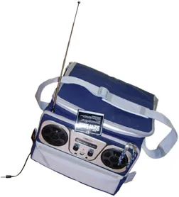 The CI Music Cooler has a built-in AM/FM mono radio and speakers. It can accept input from a CD/MP3 player via a jack and cable stowed in the radio pouch player. It runs on a single 9-volt battery. The shell is blue and gray nylon. Other features: telescoping antenna and adjustable shoulder strap. It is collapsible and is restrained by hook-and-loop straps. Square shaped, it holds 24 cans but no room for ice.