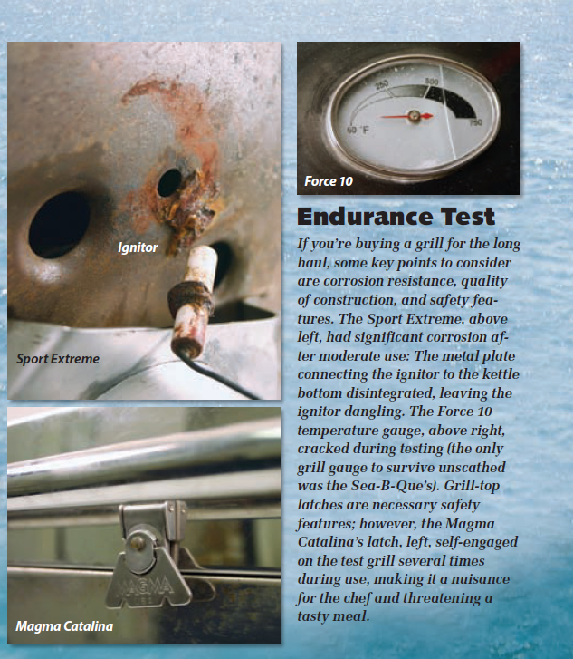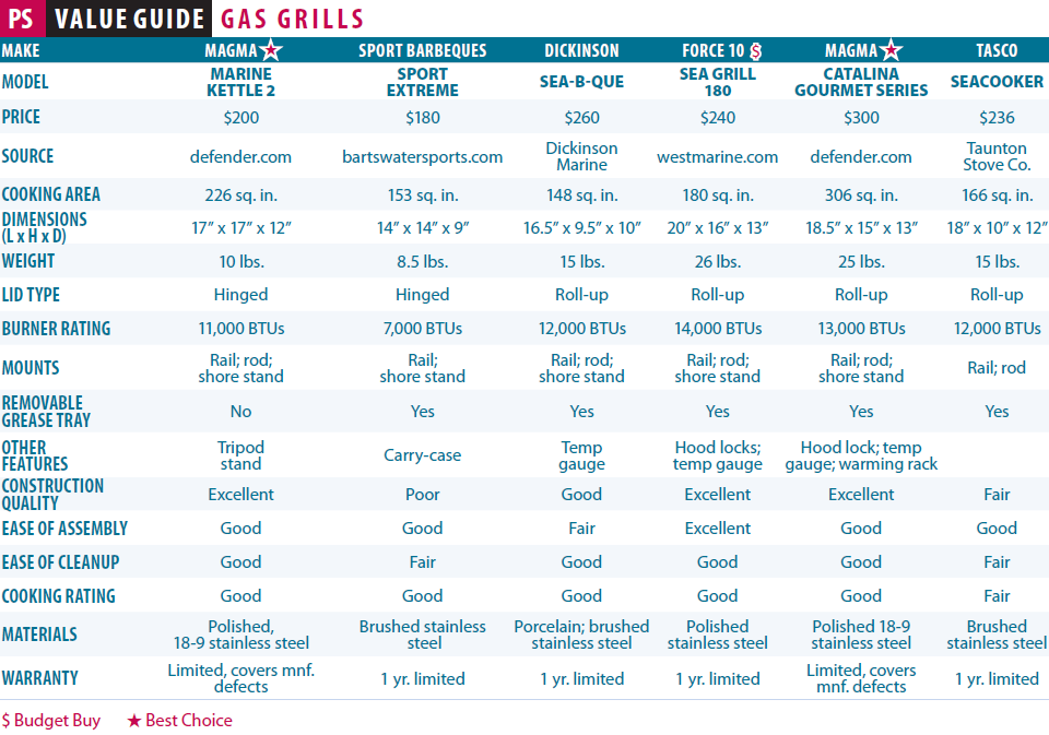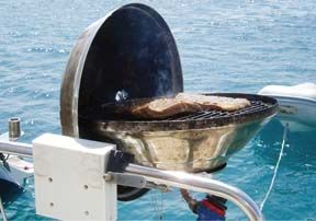 We looked at barbecues from Magma, Force 10, Tasco, Dickinson, and Sport Barbecues, and found that the price range was not as varied as the range in quality, from the metalwork to the mounting hardware. PS testers evaluated each grill for heat distribution, mount stability in a swell, ease of cleaning, and quality of construction. For test details, see the “PS Turns Up the Heat” sidebar.