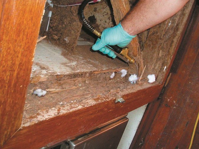 Termites. Cabinet damage is bad, but if they get into the glassed-in wood, the boat may become a total loss is short order. Bug bombs don’t work—the galleries are too deep. DIY injections are sometimes effective against minor infestations, but often as not they fail to reach the whole colony. Our advice is act immediately; while you fiddle around with do-it-yourself solutions, the bugs are chewing wood and devaluing your investment. Better to admit that its time to call in the professionals.
