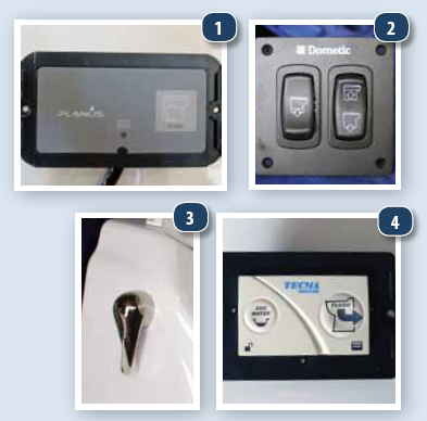 4. The two-button Thetford-Tecma switch for the Silence Plus has timed fill and flush functions, as well as a full-tank light, an important feature.