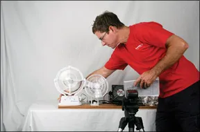 The air output, or wind speed, was tested in feet per second using a Kestrel 1000 pocket weather meter attached to a camera tripod and set 3 feet in front of the fans. Testers were well aware that simply measuring wind speed coming off a fan is a relative indicator of forced air movement, and the reading can be different from the total volume of air or CFM (cubic feet per minute) that manufacturers use to rate their fans. Current was measured at 12.3 volts with an Actron digital multimeter with accuracy /- 1.2 percent.