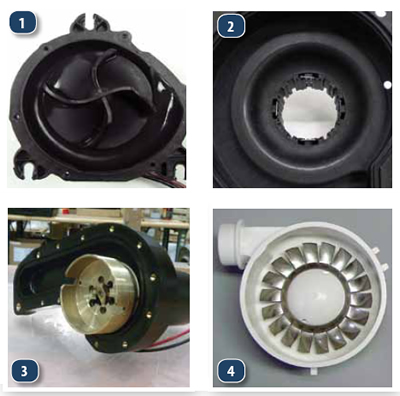 1. Spinning vanes on the Thetford-Tecma Silence’s convex macerator impeller sling emulsified liquid to the outside of the pump body.