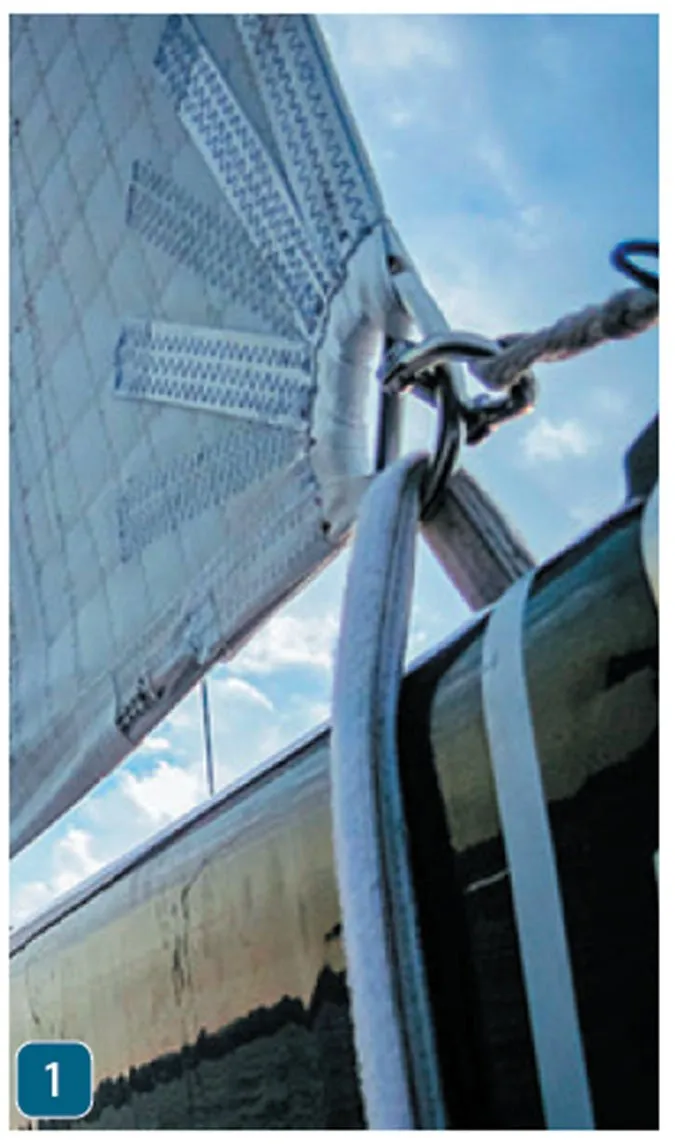 Tack strap. A less common application is holding the mainsail tack tight to the mast when reefed. Typical slab reefing systems are good at pulling the sail down, but the outhaul is sheeted hard in a strong wind, the bolt rope or sliders can be pulled right out of the track. Again, a double-sided Velcro strap is fast and strong. At least 6 inches of Velcro for each 100 square feet of sail area and at least two full wraps around the boom.