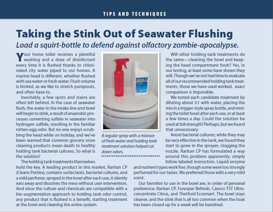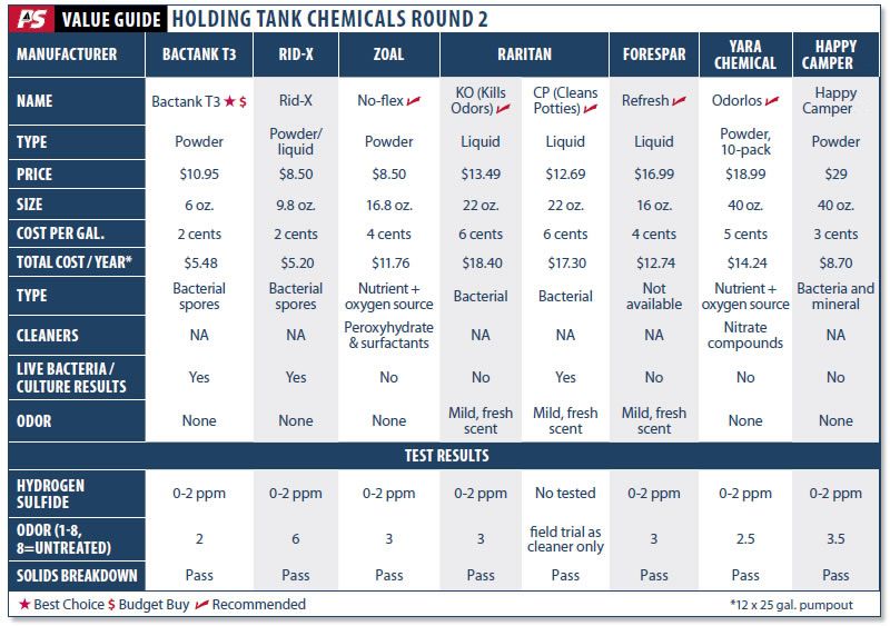 Two familiar manufacturers in this round are Raritan, the New Jersey-based maker known for its marine toilet systems, and the Southern California-based Forespar, a longtime player in the marine market. Other contenders included Happy Camper, which as the name implies, is geared toward the camping market; Rid-X, a familiar septic tank product; and Zoal No-Flex, a chemical powder recommended by a Practical Sailor reader.