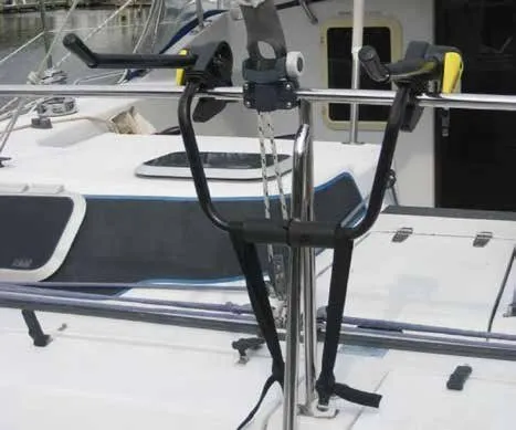 We saw these on a number of trawlers, with wide side decks and bulwarks, and the owners liked them. They could simply unfasten the bike and roll it off. But the side deck location, with handlebars and seats to snag sheets, seemed like a non-starter for most sailors.