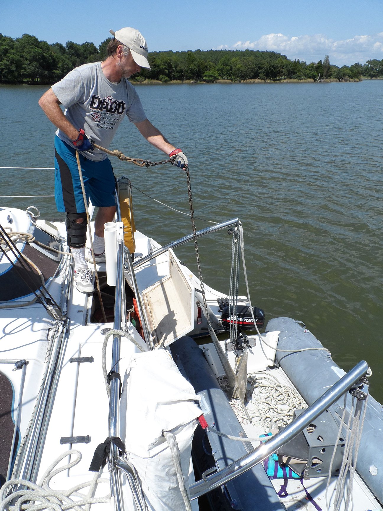 As we pondered this puzzle, we were reminded that in our own tests, the hydrodynamic effect of water flowing past the flukes of the Mantus seemed to help it self-right. The Mantuss tendency to self-right during deployment was most obvious in our tests when the boat was moving in reverse-the direction of the set. We suspect that the protocol used during the Chesapeake Bay tests-with the test boat Rachel Carson shifting to reverse once the 20 feet of chain was deployed-could have promoted this self-righting.