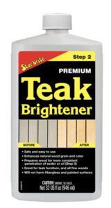 The Star Brite kit is made up of two parts as well—a Cleaner and a Brightener. Again, as far as we can tell, Star Brite Teak Cleaner is generally not categorized as a strong acid-based cleaner, though it does contain acid components. Instead, it seems to employ a combination of detergents, surfactants and other cleaning agents to remove dirt, stains and weathering from teak wood surfaces. As the formula is not published, we can only make certain assumptions. The brightener is even more of a mystery.
