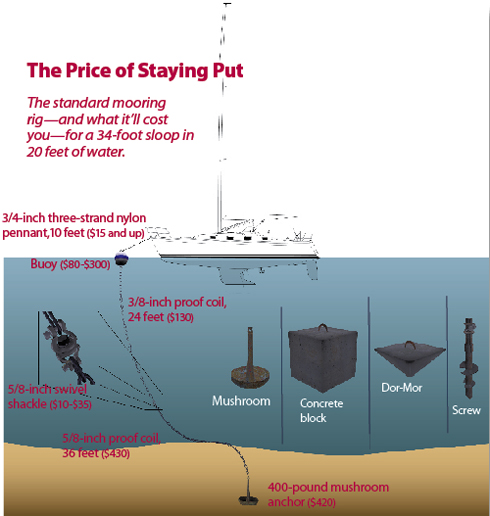 There are plenty of variations in the details of permanent ground tackle, and PS has covered most, including mooring systems designed for sensitive seabeds. The standard rig is as follows: a mushroom anchor set well in the bottom (or a concrete block, but it had better be huge, or a screw-type anchor, which works well in hard bottoms), to which a length of heavy chainis shackled, then a swivel, then a length of somewhat lighter chain, a shackle, and a rope pendant that goes to the bow cleat. A mooring buoy is shackled to the top shackle. Some mooring ball designs let the upper chain run through their centers, with the pendant shackle resting on a steel lip at their top. Some newer designs, described below, even have a spot for storing a mooring pendant and pickup stick.
