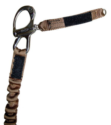Looking back at past tether designs, it’s easy to see how manufacturers have wrestled with the snap-shackle lanyard problem. For a while, the most popular solution was a 3- to 4-inch flat webbing lanyard with three or four round plastic beads strung on the end. The beads gave you something to grip, were not prone to snagging, and had a very distinct feel in the dark. However, when you tried to apply the required force to these balls, they tended to slip out of your hands, particularly wet or gloved hands.