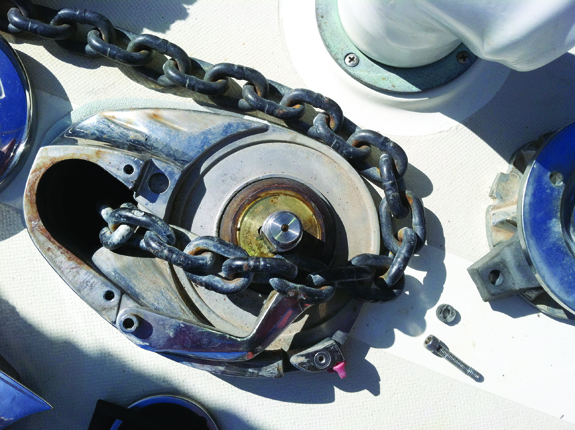 One solution would be to switch to all-chain rode. There would be less twisting, but as we found last weekend (Helmick uses all 3/8-inch chain), even all-chain rodes can confound a windlass. In my view, an all-chain rode is never a bad idea. Another issue is that compact vertical windlasses are a compromise and don’t strip chain as well as a high-quality horizontal windlass. Technical Editor Ralph Naranjo put together a thoroughly researched report on the demise of the well-made windlass back in 2008. He also guided readers through a step-by-step refit of a Nilsson windlass, far superior to the chain-driven manual Simpson Lawrence windlasses that you find on many used boats.