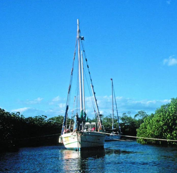 The disadvantages to this approach are many. Your boat is physically closer to shore and the hard stuff that can hole your boat. Most mangrove areas are routinely inundated by storm surge, reducing much of your protection against the wind and swell. Chafe is an ever-present risk. Some big trees lining canals have weak root systems and are likely to topple.
