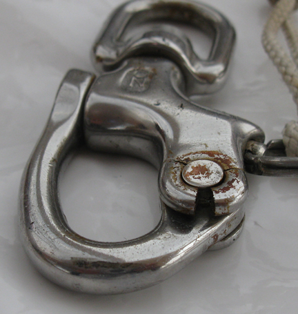 For more on stainless-steel corrosion, check out Marine Metal Warning,Used Stainless Steel Hardware, and the blog post What’s Hiding in Your Rig, and Cleaning Stainless Steel. You can also link to an interesting Gear Graveyard report on a different type of snap-shackle failure, available only as a PDF. That report is located in the “Also with this Article” box in our December 2009 Mailport.