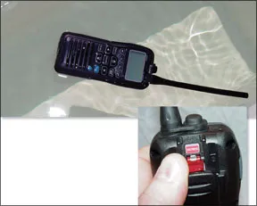 The five VHFs with a waterproof rating of IPX7 or greater (submersible to 3 feet or more) were submerged in fresh water for 30 minutes; buoyant radios were weighted. Rated only JIS4 (splashproof), the Nautico 2 (and Nautico 1, inside its dry bag) was exposed to a showerhead at a distance of 1 foot for 5 minutes. The effectiveness of locator LED lights or glow strips was also noted.