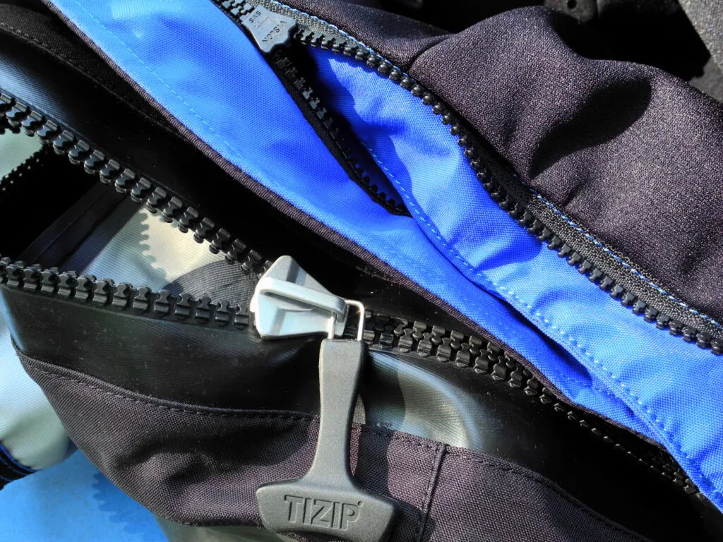 Dry suit zippers. Drysuits use the TIZIP, YKK Aquaseal, or similar waterproof zipper, and we’ve not found any of them to leak in our testing. Check to see that they can be used with gloves. Also, because many suits are designed for activities like surfing in which a front zipper would be uncomfortable, the zipper is on the back. For sailing, the front zipper is not only more convenient, it makes it easier to find relief when nature calls.