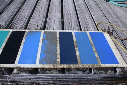 The newest panel, pictured above, has only been in the water four months, and you can see almost all of them are clean-as they should be. Keep in mind that all but a few of these paints are new, copper-free paints designed to meet new restrictions pending in California and slated to take effect in Washington. Many of them include a new biocide called Econea, which according to paint makers is less harmful to the environment than other pesticides and biocides that go into paints.