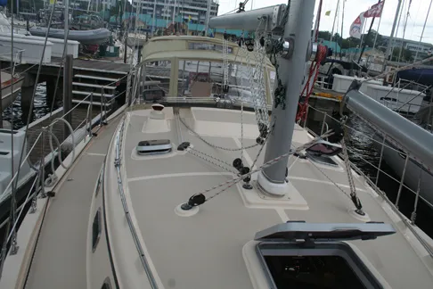 With a teak bowsprit and additional teak trim in the cockpit, IP yachts held the course that most production boatbuilders had left behind by the mid-1990s. If you see exterior wood on a Hunter or Beneteau these days, chances are its synthetic teak. That teak toerail on the new Beneteau 34? Synthetic. The Hunter e33we tested had teak pushpit seats, the rest-including a cockpit table top (to keep the salsa bowl from sliding, I suppose)-was synthetic. Catalina dropped exterior wood years ago. If history is any guide, even the faux wood trend may soon run its course. “Good riddance,” some might say.