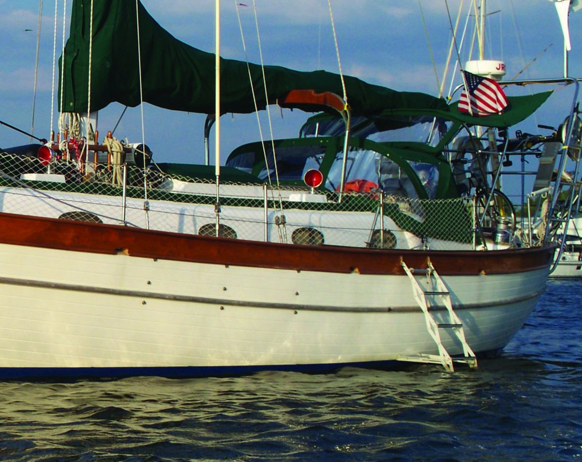 We bought a 1970 Hinckley Pilot two years ago, and since both my wife and I are of an advanced age, we wanted a very sturdy boarding ladder. We had Hinckley custom-build it for us. It’s made of stainless steel with teak steps. It’s extra-long, so that it gives you a good footing when you’re in the water, and it hooks on to the genoa track, so it has a very secure attachment to the boat. But it cost us a bundle.