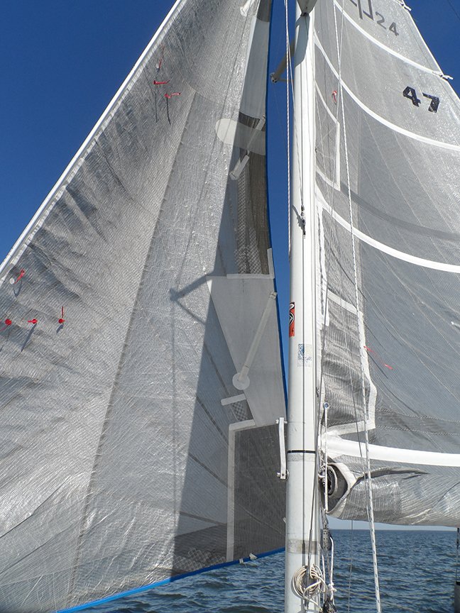 Wool yarn – Tell tales are perhaps the most common item, and though other materials fly more easily, wool seems to dry fastest and not get stuck to the sail. Some attach them with sail tape. You can also thread them through the tiniest possible hole with a knot on each side. Instead of struggling to thread fat yarn through a small needle (hint, push the needle onto the thread), thread a double strand of light thread through the needle, lasso the thick thread and bring it back through (See Adding Telltales to Your Sail, PS May 2018).