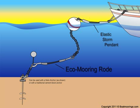 Three manufacturers offer products in this class. Eco-mooring System is effectively a super, heavy-duty bungy cord. It operates on the same principle as others like it, including the Seaflex Mooring System and the Hazelett Mooring System. These mooring rodes incorporate an elastic rode that allows mooring fields to pack more boats into smaller spaces. The elasticity also helps reduce shock on boat hardware.