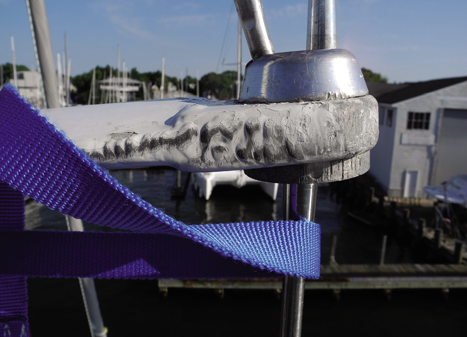 Another surprising trouble spot on the average keel-stepped aluminum mast is the mast boot. Water lying between the rubber mast boot and the mast tube can cause severe corrosion of the aluminum tube on boats used in salt water. This is particularly common in mast boots secured with stainless-steel hose clamps, and corrosion can occur even when no water reaches the interior of the boat. At least once a year, loosen the mast boot. Bedding the boot to the mast will alleviate but not necessarily completely prevent this type of damage. The area under the mast boot is probably second only to the mast heel as a potential trouble spot.