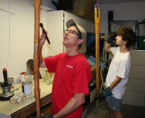 As for me, I’m in no rush to get on the water. There will be time for that. The lull in waterfront activity has allowed me to catch up on some long-delayed work projects with my younger son Jake. At present we’re on a brightwork binge, with hatchboards and tillers lined up in the garage (doors wide open, and well-ventilated with fans, of course) awaiting another coat. For the time being we’re buoyed by another quote to carry us through these days. Something Kenneth Graham said about messing about with boats.