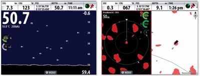 Radar can be displayed as chart overlay, as a single full-screen, or split screens in combination with either the sounder or charts. (The NSS8 and NSS12 can display two-, three-, or four-way split.) Radar overlayed on a chart could then be used as a split screen with the sounder, radar alone, or chart alone. Testers found the best default setting with active radar was a full screen with radar overlay. For better radar detail, you can switch to full-screen, radar-only mode to confirm any targets that might get lost in the chart detail.