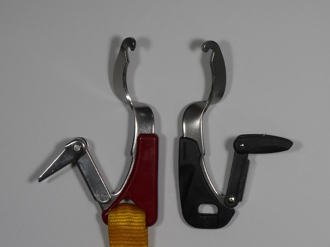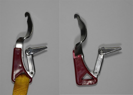 The above video illustrates a possible mode of failure for Mr. Speirs’ tether, or any tether connected to a jackline that connects to or passes adjacent to a large cleat. In this test, the tether hook is attached to a taught jackline and the gate of the tether is pressed open with very little weight upon it (about 25 pounds). The nose hook of the open tether snap hook then slides up the basket snags on the tether, and the body (spine) of the hook, under loads of as little as 350 pounds, straightens before fully releasing. The gates on sailing tether snap hooks are not required to be tested for resistance to direct pressure in this way. However, climbing carabiners and ANSI (industrial) snap hooks are tested for this. The UIAA-121 Type K tests for climbing carabiners, for example, must resist at least 1KN (about 225 pounds) of direct pressure. Our testers noted that some older versions of the Gibb design better resisted opening under direct pressure because the locking latch met the basket at a right angle. In current designs, the locking latch meets the basket at a slightly more acute angle, presumably to make them easier to open.