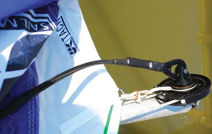 Traditional bowsprits incorporated a bobstay and even whisker stays to reduce the bending loads at the fulcrum. For our most recent test, we used an aftermarket sprit sold by sparmaker Selden. The Selden sprit is set up with a part-Dyneema and part-stainless-steel bobstay that allows the sprit to be easily retracted. Without this bobstay, there is a need for a very strong tube section and deck reinforcement at the bearing points. A bobstay or strut attachment is best if the sail is to be carried in anything but light-air, off-the-wind conditions. Our tester, Ralph Naranjo, found the releasable bobstay a good option.