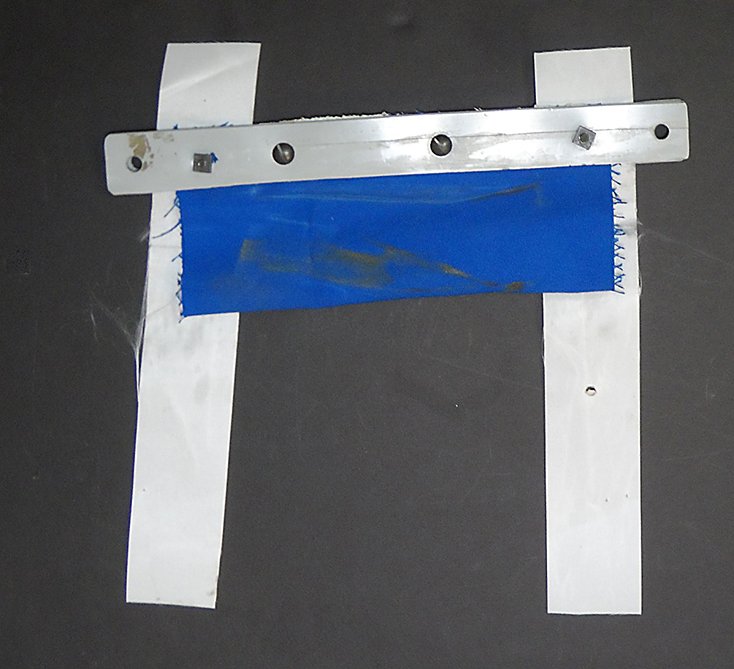 4.Cut 2 strips of polyester sail cloth 1.5-inch x 8-inch. Punch two -inch holes on the center line, near the center, 1.25 inches apart.