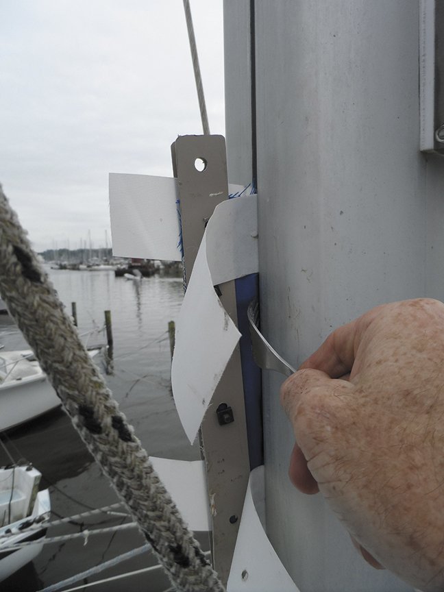 The simplest DIY cleaning tool is a two-foot section of luff tape or prefabricated bolt rope. Place a grommet in each end, close to the tape but not so close that it can bind in the groove (3/16-inch clearance).