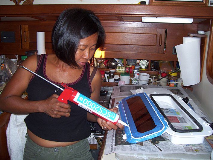 But there is a partial solution to using an adhesive sealant with polyethylene. While the chemistry of polyethylene is stable, it will burn. If exposed to flame, the surface layer undergoes chemical changes that dramatically improve bonding. In what is known as flame treatment, a propane torch is played across the surface of the plastic until the appearance changes from reflective to dull. It is important not to overheat as the material will melt. You need just enough heat to take away the shine. A more certain way to judge the effectiveness of the treatment is to pour a little water on the surface. If the water beaded instantly, bonding will still be difficult. However, if the water sheets out for at least a few seconds, as it would on a well-prepared fiberglass or metal surface, it should hold a bond.