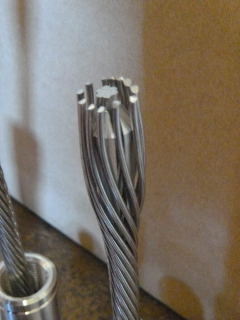 The wedge has one or more slots in its side, allowing the wedge to compress onto the core yarns, generating friction there. With Sta-Lok and Norseman, it is possible to get a cover yarn stuck in the wedge slots. If this happens, the wedge wont be able to compress onto the wires core, and the core wont be able to take its share of the load. If a rigger slides the wedge too far onto the core, the projecting wire ends of both the core and the cover will mash into the inside of the terminal, deforming the wire. If the wedge is not on far enough, it can slip off the end of the core and fail to compress the core. In addition, the cover yarns will not have the proper amount of bearing against the wedge. Each brand requires a different amount of core to be showing.