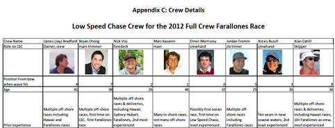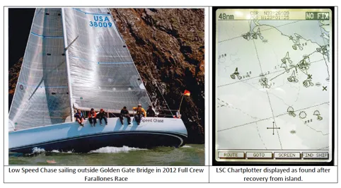 I was pleased to see that the panel went into scrupulous detail regarding the personal safety equipment used by each sailor aboard Low Speed Chase, their location on the boat, and as much as could be determined regarding their fate. The details of the GPS tracks of Low Speed Chase and 13 other competitors, superimposed on Low Speed Chases route the previous year-even closer to the rocks than in 2012-was particularly telling.