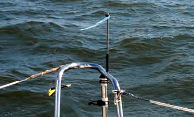 For more than 20 years, I always had bow-mounted vanes-a Telo Cat on my beach cat and a Windex sport on my Stiletto 27. The Telo Cat was sheltered under the forestay bridle and bowsprit and was never damaged. The long bows of the Stiletto kept the Windex out of harm’s way-although the Stiletto had a spinnaker, it reached faster than the wind and we always tacked downwind, jibing the chute inside like a jib and keeping the sail and sheets away from the bows. When I moved on to a PDQ32 catamaran, a cruising cat with a chute that is jibed outside, there was no place where either a sail or sheet couldn’t pulverize the vane in short order. I learned this the hard way, crumpling several commercial vanes. The solution was not to build something strong, but rather to build something that could flex with the assault and pop back up; a flexible wand topped with a length of yarn.