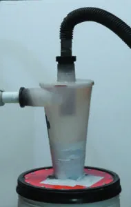 Sold by Oneida Air Systems, this bucket- sized cyclone is similar to those used in sawmill dust collectors and Dyson vacuums. It is highly efficient on coarse dust, and allows practically nothing through the vacuum filter. With fine sanding dust from bottom paint, it still stops about 90 percent of the dust. We liked it best when installed in a screwtop lid, which complicates assembly, but makes it more versatile.