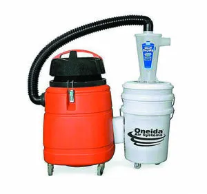 | ONEIDA AIR SYSTEMS | Dust Deputy | 4 gallons | Excellent | High | 1-hour | Adapters required for 1-inch hose; most efficient with fine paint dust; tippy (strap down); works with a compact household vacuum add $8 for screw-top lid if desired; add $4 for bucket can be used with a wet/ dry vacuum; you can exchange buckets for more capacity | $55 |