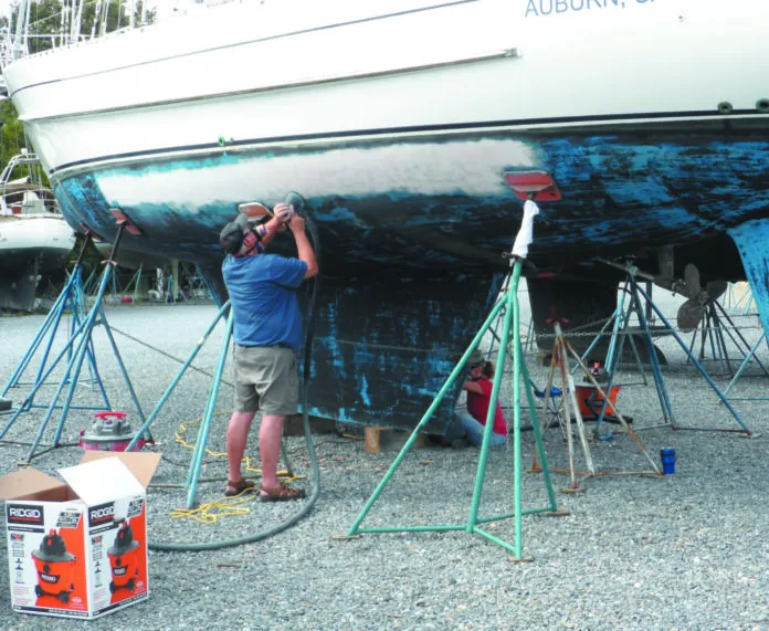 The bucket on the DIY version intercepts about 75-percent of antifouling paint sanding dust, and the Dust Deputy and Duststopper suck up about 90 percent. Filter clogging with the Porta-Power has dropped from a clogged filter every hour to less than one clog per day. The dust collector eliminates the need to clean the wet/ dry vacuum filter, greatly extending the usable life of these expensive fine dust filters.