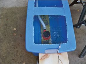 The test setup incorporated two plastic tanks, a 45-gallon supply tank and an 18-gallon receiver tank. Prior to each pump run, approximately 30 gallons of water was put into the supply tank. Each test pump was temporarily mounted onto a half-inch-thick piece of wood, placed at the bottom of the supply tank, and held in position with lead weights. Centrifugal pumps are not self-priming, so they must always be installed below the level of water they will be pumping, at all angles of heel.